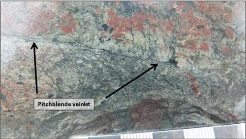 Figure 3. RK-13-05, 220.8m: pitchblende veinlet in haematised breccia