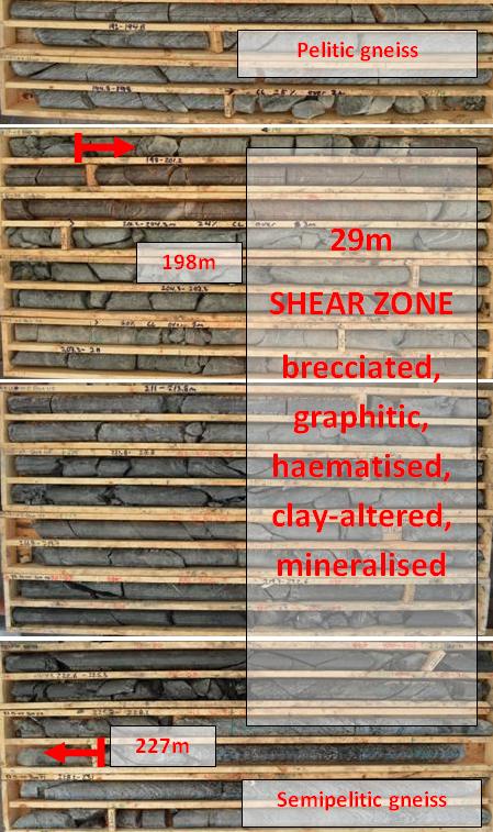 Basement lithologies intersected comprise a variety of quartz-feldspar-biotite (± garnet) microgneiss and gneiss, with local graphitic units. Examination of all basement lithologies intersected indicate that the entire area drilled comprises a strongly tectonised zone with a number of discrete shear zones associated with hematitic and clay alteration, within a variety of graphitic material. As previously noted, graphitic lithologies have been observed in the basement at Rook 1 mainly as discrete lithological units. Other thin graphitic occurrences have been logged as graphitic material associated with structures such as shears or slip planes.