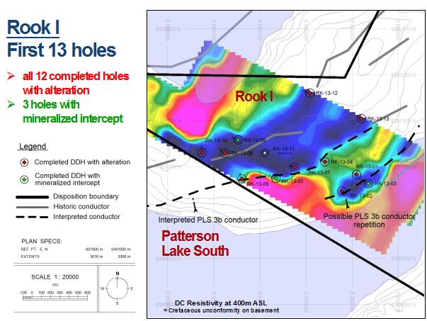 - Mineralization in holes RK-13-03 and -06 is located on other parallel conductors interpreted to be possible repetitions of the main PLS 3b conductor.