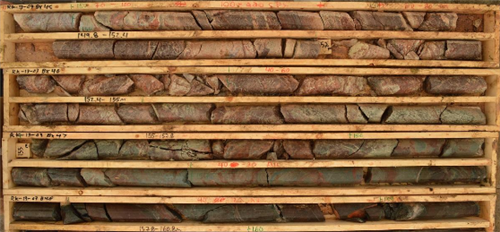 Figure 2: Highly Altered Haematised breccia zone, Rook 1 hole RK-13-03, 149-161m downhole